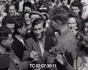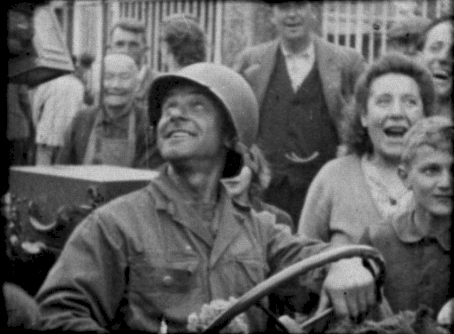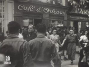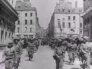 La population rennaise et des soldats américains sont rassemblés sur une grande place. Des Jeeps et des transports de troupes défilent dans la rue. Les rennais libérés et les soldats forment une grande farandole dans la rue. Des soldats discutent avec des femmes. Un groupe accompagne une femme tondue. Défilé de tirailleurs sénégalais. Un soldat lance un message par haut-parleur, discours de Victor le Gorgeu et Jean Marin depuis le balcon de l’hotel de ville drapeaux français et américain ; une station de radio mobile à Granville.