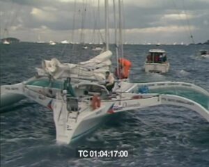 Images du départ de la Route du Rhum 1990. Il s’agit de la 4eme édition de la course transatlantique en solitaire à la voile, courue tous les quatre ans entre Saint-Malo et la Guadeloupe. Plans sur le trimaran Océanopolis ville de Brest, piloté par Hervé Cléris.