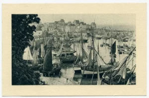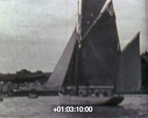 Régate des bisquines à Cancale, vue sur les régates en pleine mer, puis entrée des bateaux dans le port de Cancale. Vue des quais et de l’activité portuaire : déchargement des huîtres, puis tri des huîtres.