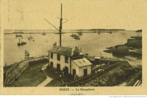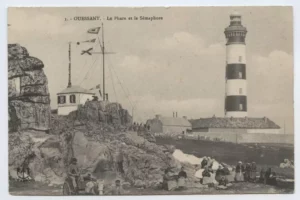 Ouessant – Le phare du Créac’h et le sémaphore. Au premier plan, des femmes et des enfants assis sur un rocher.. Date : 20e siècle, début. Fonds : Cartes postales